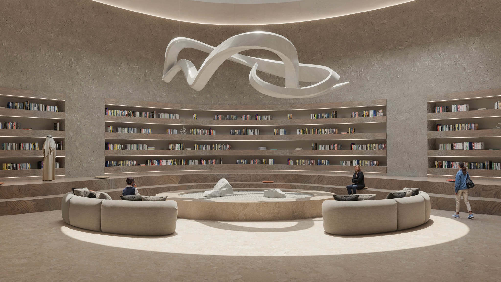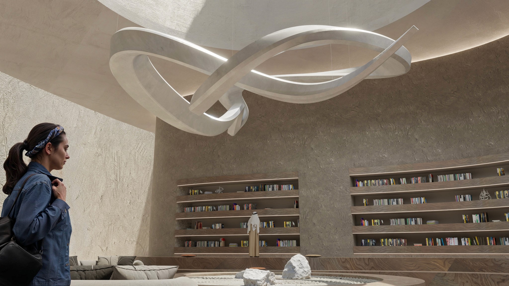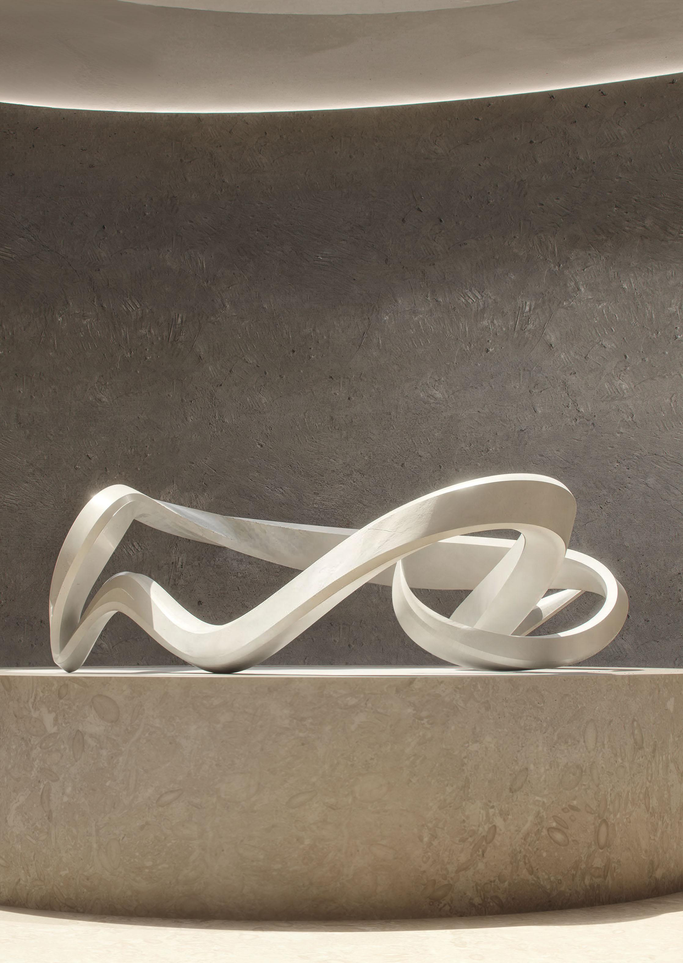 A spatial retreat structured through stillness, continuity, and suspended form. Calm Reading Corner is a conceptual spatial study to showcase the Sakina Series. It explores how a suspended sculptural element can define a place of stillness, focus, and retreat within an architectural environment. The project is presented as a conceptual variant of the Sakina sculptures, illustrating how the work may exist not only as an object, but as a spatial anchor within interiors such as libraries, hospitality spaces, or private settings. Select sculptural variants from the Sakina Series are available through private inquiry.